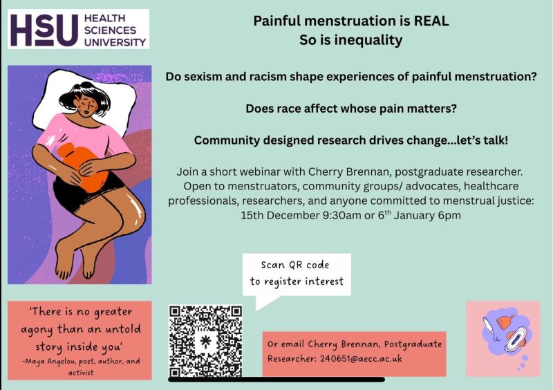 Join one of two short webinars (15th Dec 9:30am and 6th Jan 6pm) to explore menstrual justice, intersectionality, and community-designed research. Open to menstruators with lived experience, healthcare professionals, researchers, and advocates.